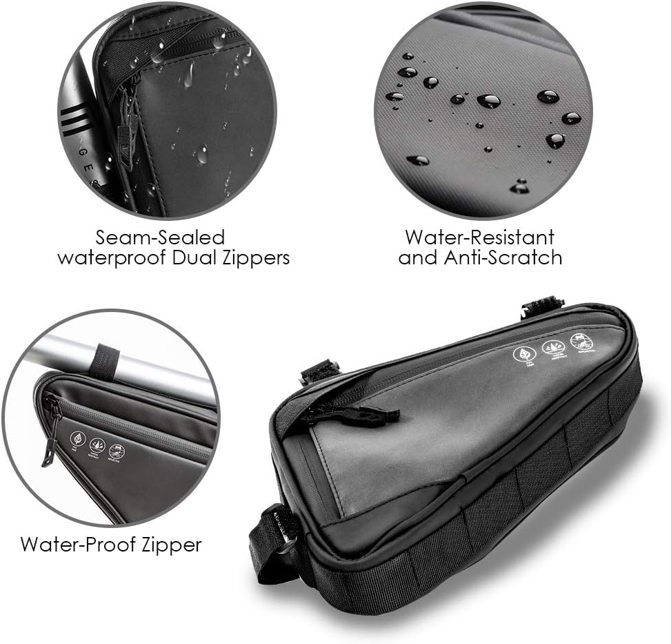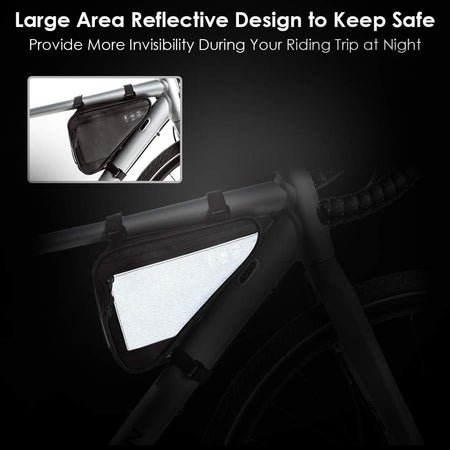 Highquality material, waterproof performance This bike bag is made of 600D Oxford cloth, which is highly waterproof and scratchresistant. The zipper has sealed seams and is waterproof, effectively keeping rain out and keeping all your belongings safe and dry. Do not immerse this handlebar bag in water for extended periods.Adjustable Attachment and Straps Multiple loops are located around the bag, allowing you to remove the straps to attach the bag to the front or back as needed. It comes with three adjustable straps two for the top tube and one for the seat tube. The triangular design prevents slippage, even on uneven surfaces, and the straps are easy to attach. This bag is compatible with most mountain bikes, road bikes, and city bikes.Extensive reflective design and organized compartments This bike bag features an extensive reflective design for enhanced visibility in the dark, ensuring safer cycling. Additionally, two internal compartments on one side help you keep your belongings organized. Theres also an interior hook for neatly hanging keys.Large Capacity, Wide Opening This bicycle inner tube bag measures 22.7 x 15.5 x 5.5cm and features large pockets on both sides, allowing you to easily carry your daily necessities and cycling gear, such as your phone, power bank, gloves, sunglasses, flashlight, mini pump, repair tools and other accessories. Its the ideal solution for carrying small cycling gear on long rides, making it perfect for outdoor cycling. The large zipper opening on the front of the bag provides easy access, and the nonslip zipper pullers are easy to grip, even with winter gloves.Slim design, beautiful shape This front tire bag is made of highquality materials for durability, wear resistance, and an attractive appearance without deformation. Its slim design and placement under the bikes top tube effectively reduce wind resistance and prevent leg impact while cycling. Weighing only 175 grams, it is ultralight and easy to carry.