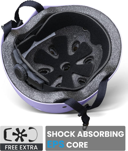 Protect kids with both comfort and impact resistance. REINFORCED ABS SHELL THICKENED SHOCK-ABSORBING EPS CORE provides solid protection when skateboarding, rollerblading, cycling and etc.