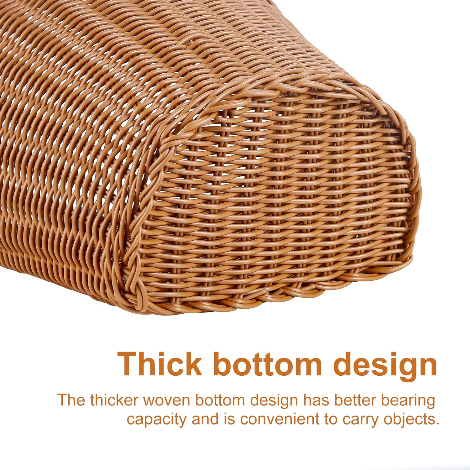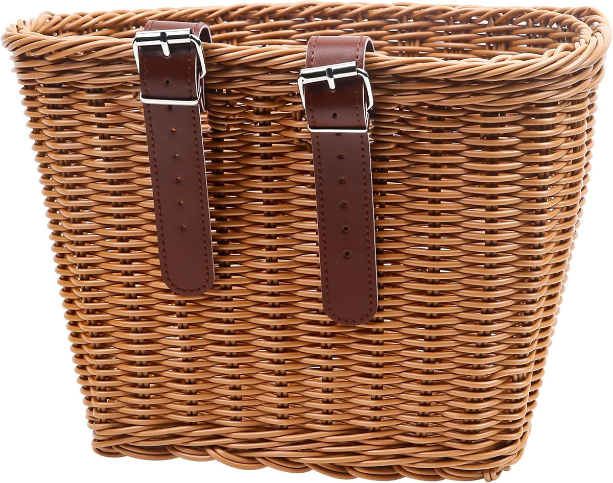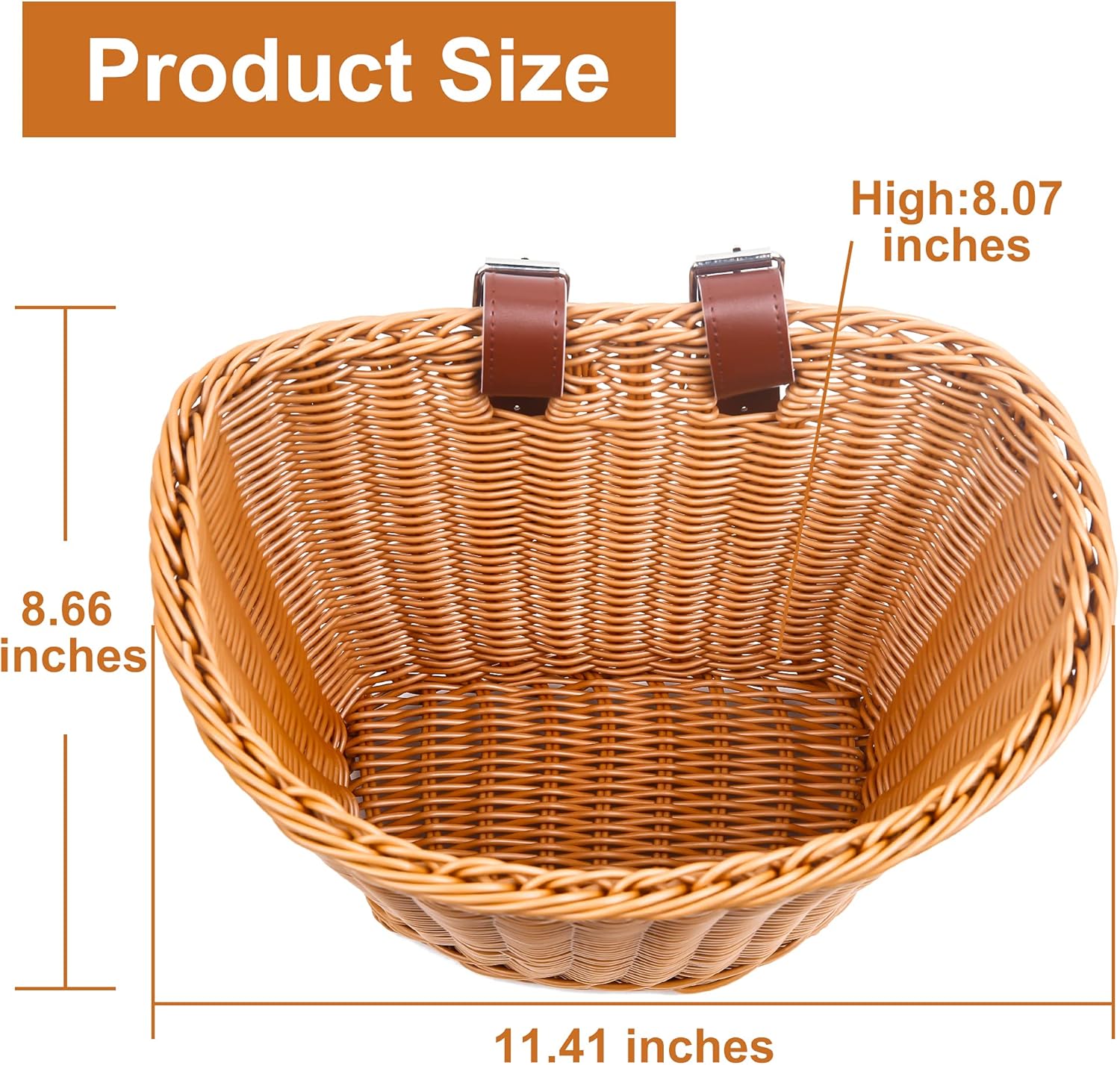 This handwoven bicycle basket, made of synthetic plastic, is elegant, simple and stylish.This imitation wicker bicycle basket is durable, safe, chemicalfree and wearresistant.This waterproof, woven plastic basket is easy to clean simply wipe away stains with a damp cloth.This durable scooter handlebar storage box is versatile. Its highly versatile and suitable for a variety of bikes, including road bikes and mountain bikes.This versatile bicycle basket offers space for books, stationery, school bags, and food. The leather straps make it easy to attach and adjust the position and firmness. You can also remove the straps and use it as a household basket, grocery basket, storage basket, or more.