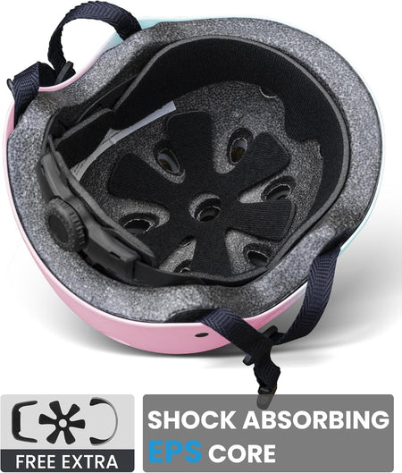 Protect kids with both comfort and impact resistance. REINFORCED ABS SHELL THICKENED SHOCK-ABSORBING EPS CORE provides solid protection when skateboarding, rollerblading, cycling and etc.
