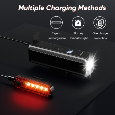 Illuminate your night rides with confidence and style using this powerful 1200-lumen bike light set. Designed for cyclists who demand both performance and safety, this high-output LED system features a bright front headlight and a highly visible rear taillightperfect for urban commuting, mountain trails, or late-night adventures. The ultra-bright beam cuts through darkness like a car headlight, giving you full visibility of the road ahead while ensuring drivers see you from far away. With six versatile lighting modes on the front lightincluding high, medium, low, SOS, slow flash, and fast flashyou can customize brightness based on terrain and traffic conditions. The rear light offers four distinct modes: steady red, slow flash, normal flash, and rapid flash, enhancing your visibility to vehicles behind. Both lights are powered by a built-in rechargeable battery that charges via Type-C USBfast, convenient, and compatible with most devices. The included digital display shows real-time battery level so you never run out of power unexpectedly. Built from durable aluminum alloy, this light set is rugged enough for all-weather use and rated IP65 waterproofresisting rain, splashes, and dust. Its lightweight design and one-touch adjustable mount make installation effortless on any handlebar or seat post. Whether you're biking home after work or exploring scenic routes at night, this smart, reliable lighting system keeps you safe, seen, and ready for every ride.